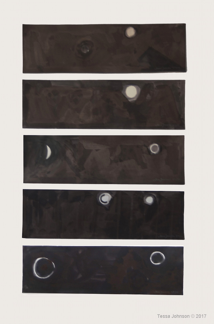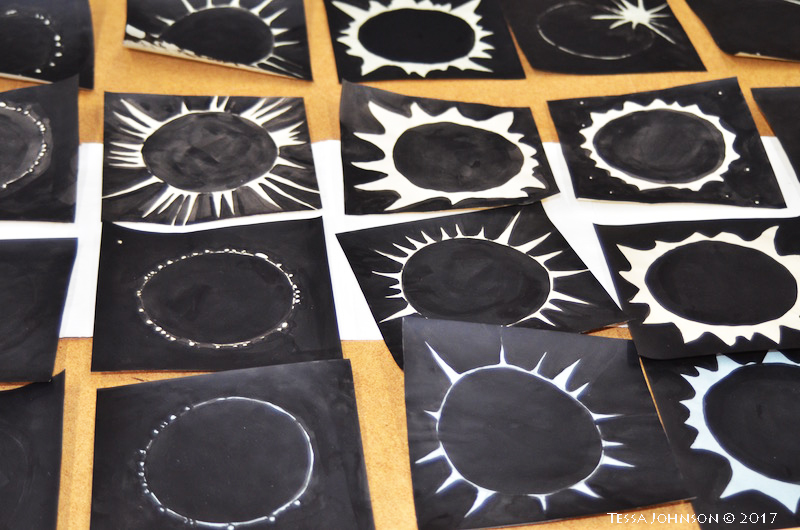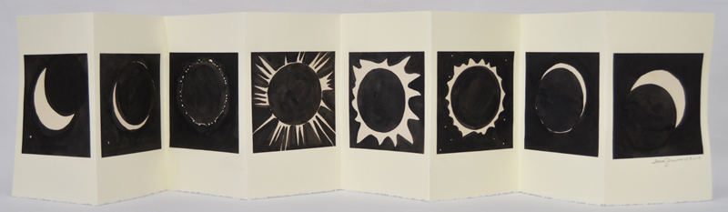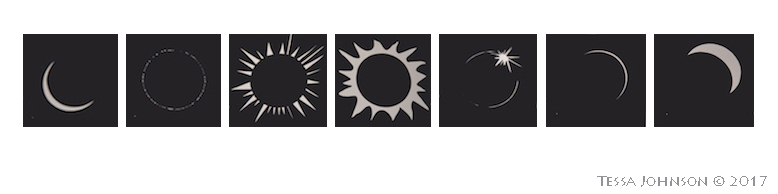 The total Eclipse of the SUN is anticipated by many and the MOON is the supporting character. I made drawings in antisipating of what I will see ~ it will only last a few minutes ~ it could be cloudy. It will be a fast and furious show. The ECLIPSE traveled through my stomping grounds. Large numbers of people traveled such great distances to see this phenomena, which was amazing in itself. ~ a pilgrimage. The weather cooperated. After the Eclipse, I did a number of studies of the various phases. It was truly a facinating and wonderous event. August 21, 2017 around 11:30 am