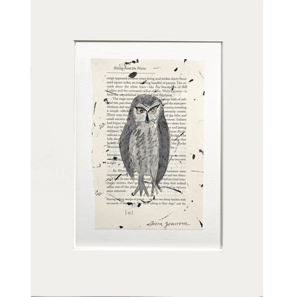 | Owls collaged on pages from Rising from the Plains. Each piece is done with ink on book pagesm watercolor and graphite then collaged together on acid free board. 11 x 14 framed, image size 7 x 9 image size. |
